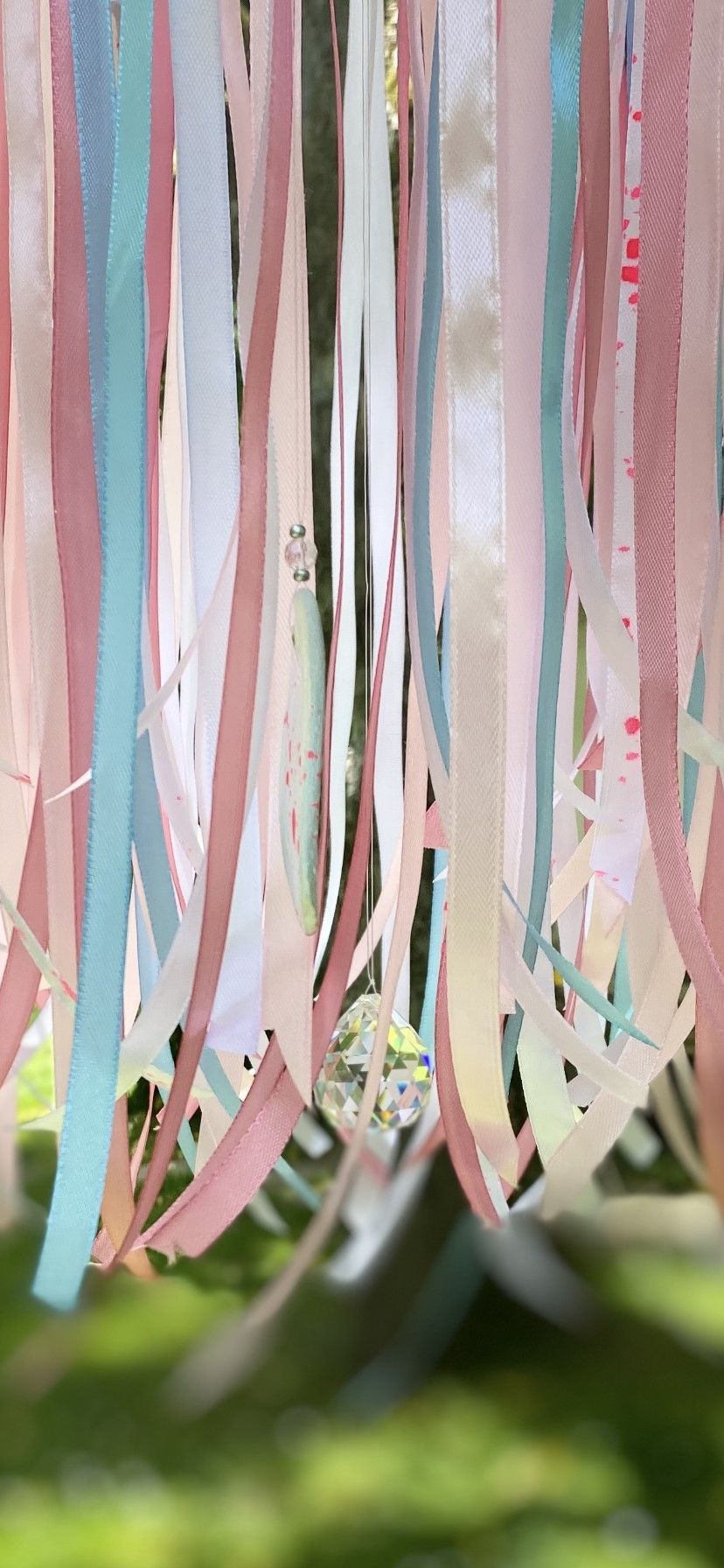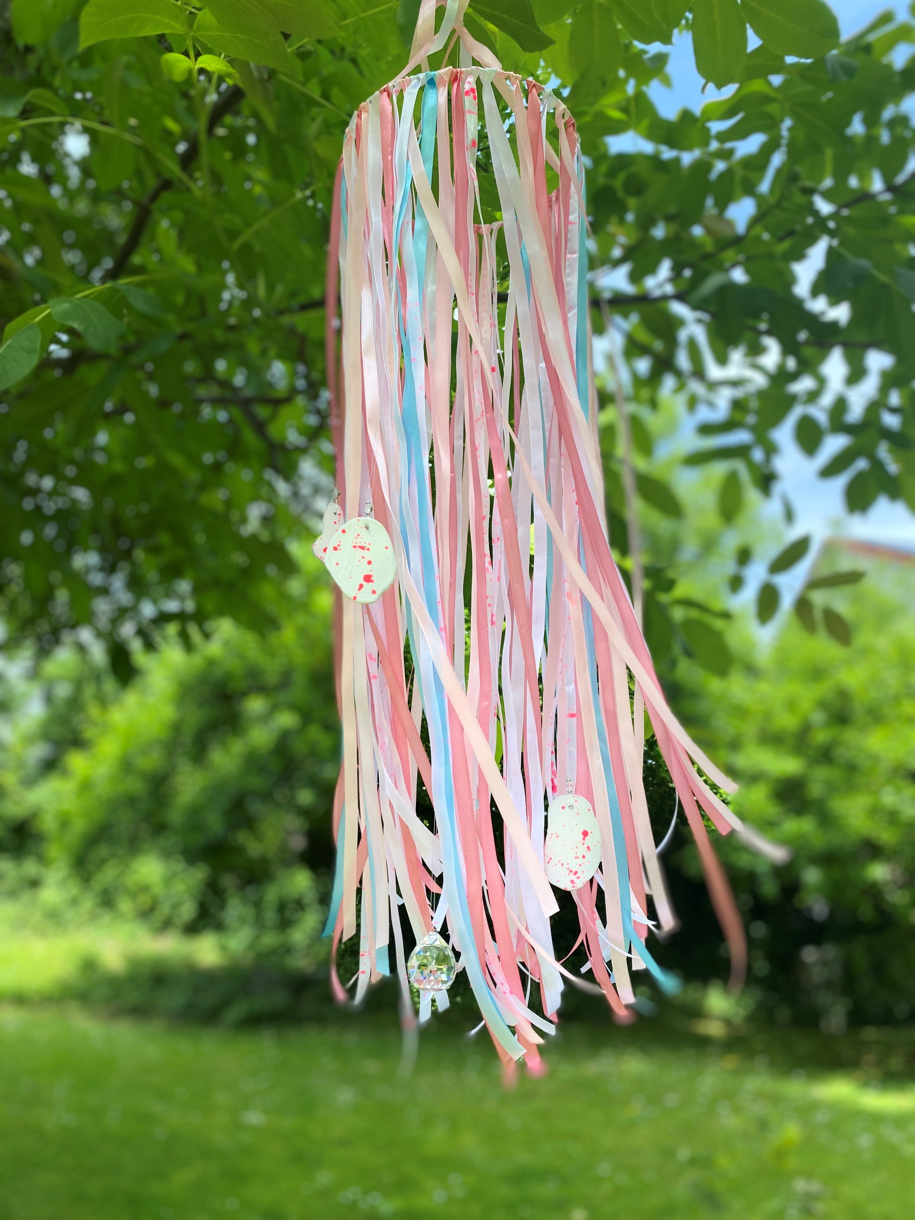 Gestalten Sie ein farbenfrohes Windspiel für Ihren Balkon oder Garten aus Geschenkbändern. Materialkosten werden im Kurs abgerechnet.